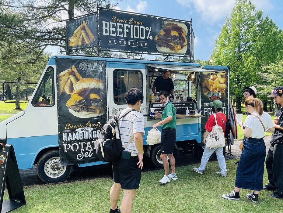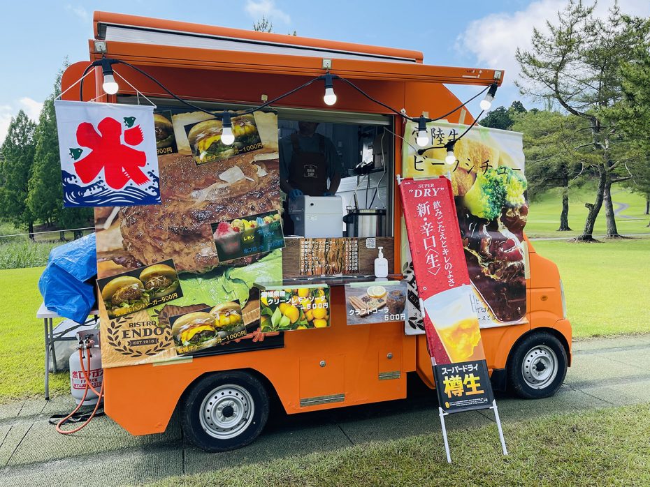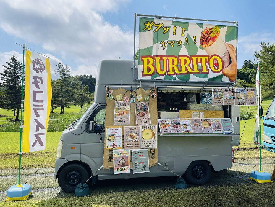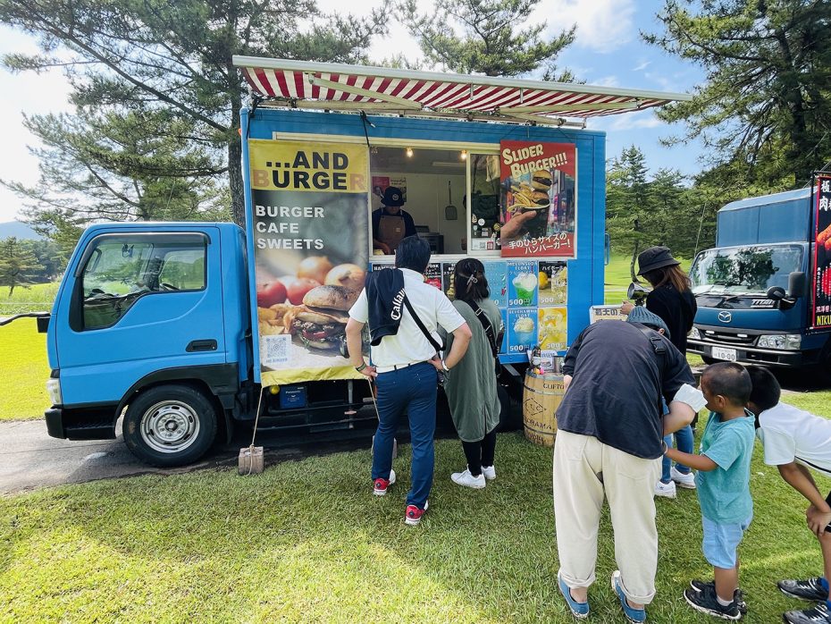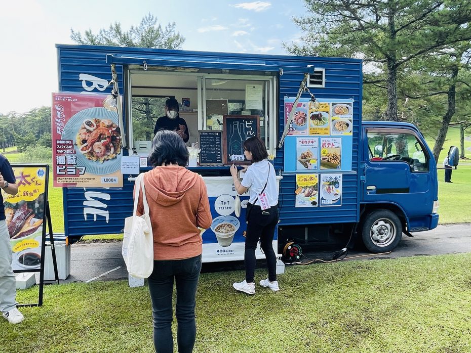 宍戸ヒルズカントリークラブで20回連続開催となる「BMW日本ゴルフツアー選手権森ビルカップ」。6月3日(土)には、地元の皆様への感謝の気持ちを込めて「かさまスポーツ&フードフェス」を開催しております。台風2号の影響でお天気が心配されましたが、イベントの開始に合わせて会場は青空が広がり出しました! 11時頃に営業を開始したのは、フードエリアにある12店舗のキッチンカー。お昼時には多くのギャラリーが集まり、人気店には長蛇の列ができていました。全12店舗を紹介します。
