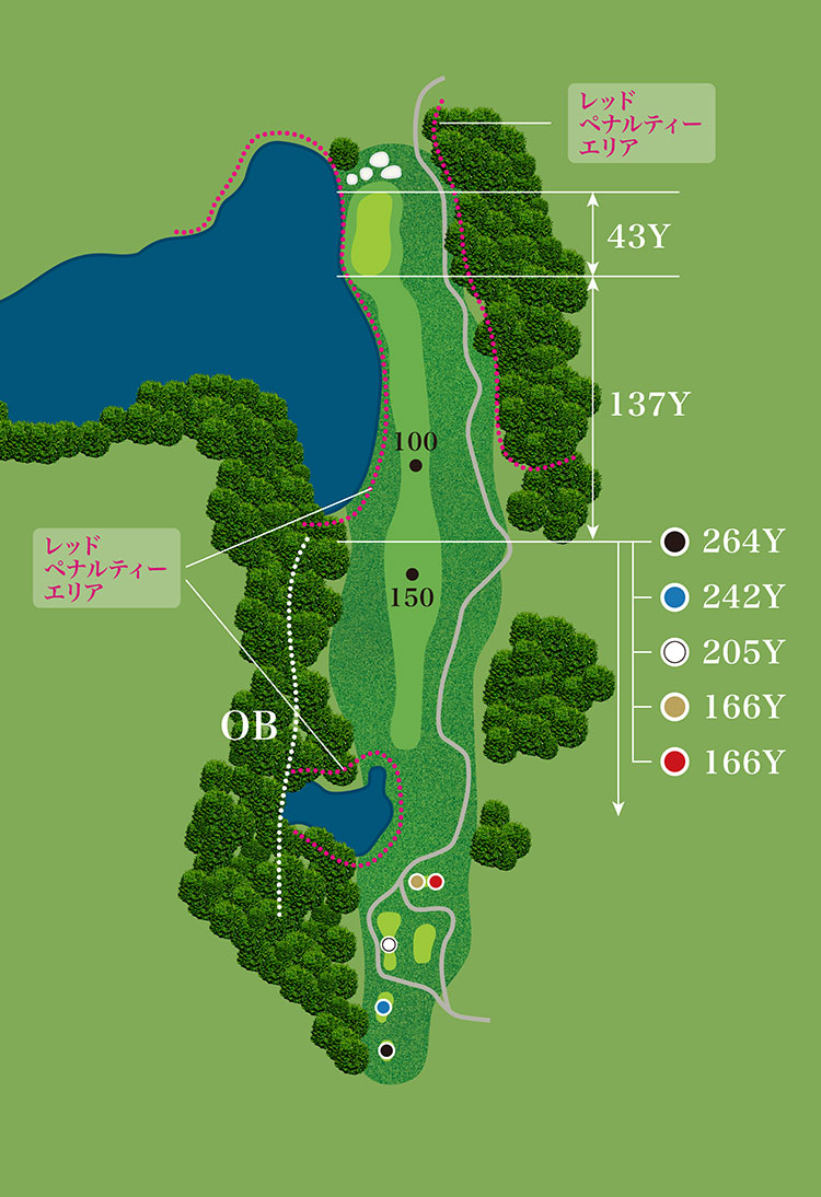 FW左サイド250ヤード地点に池があり、3Wでティーショットする選手が多い。しっかりとFWを確保したいティーショットとなる。グリーン左サイドに池があり、勇気を試されるショットとなる。2段グリーンのため、奥の段の左サイドにピンがあるときは大変難しい。