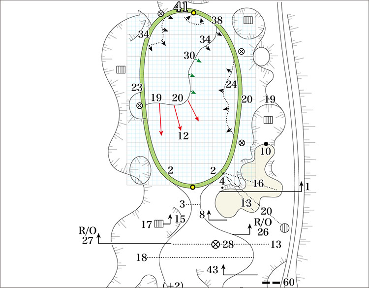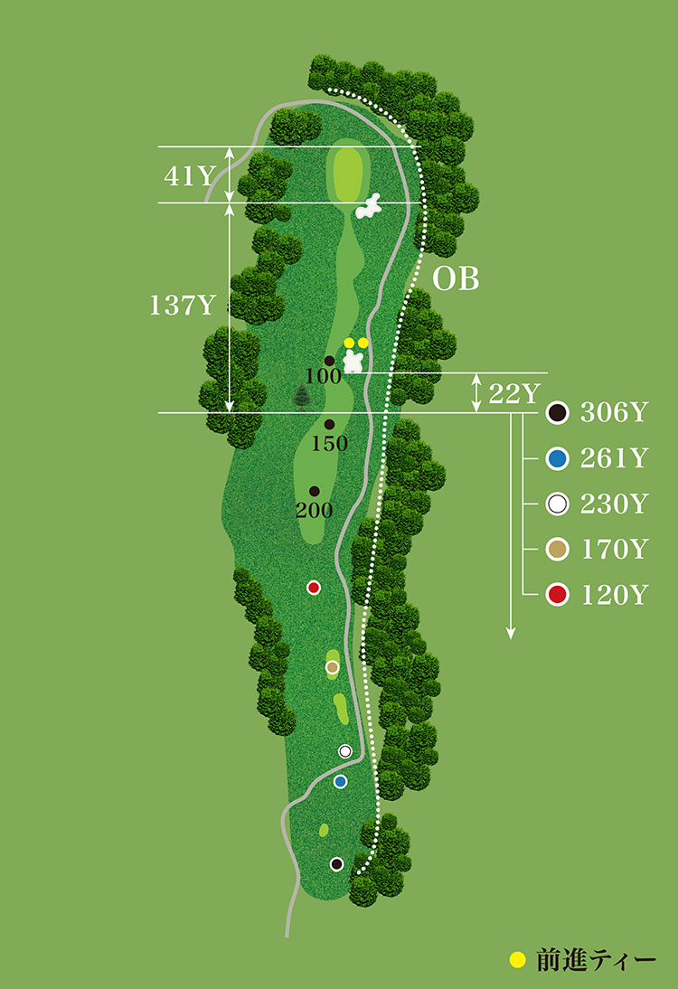 右サイドにOBもあり、距離の長いPar4。ティーショットはドライバー or 3WでしっかりとFWを捕らえたい。フェードが求められるショット。グリーンは左奥、右、手前と3つの面がある。2ndショットは距離も長く、プロの技を味わうことのできるショット。