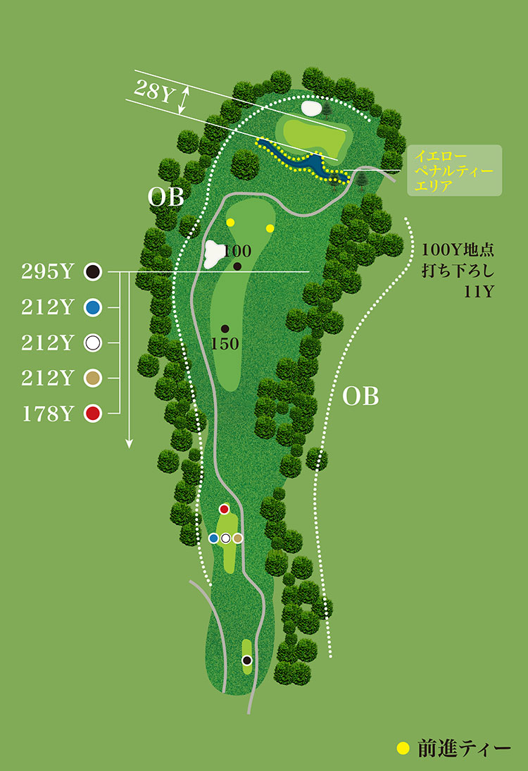 グリーン手前から下り傾斜とクリークが構えるPar4。ティーショットが270ヤード飛ばないと、次でグリーン面が見えない。また左サイドに行ってしまうと1打で戻ることが難しい。打ち下ろしの距離感と風の読みが重要。もしラフからのショットの場合、フライヤーの計算も含め大変難しい。